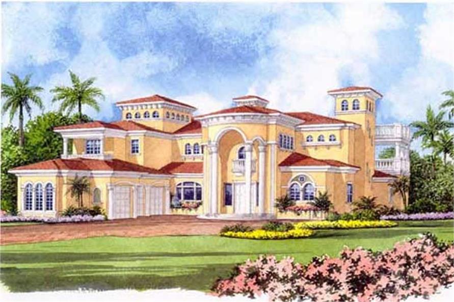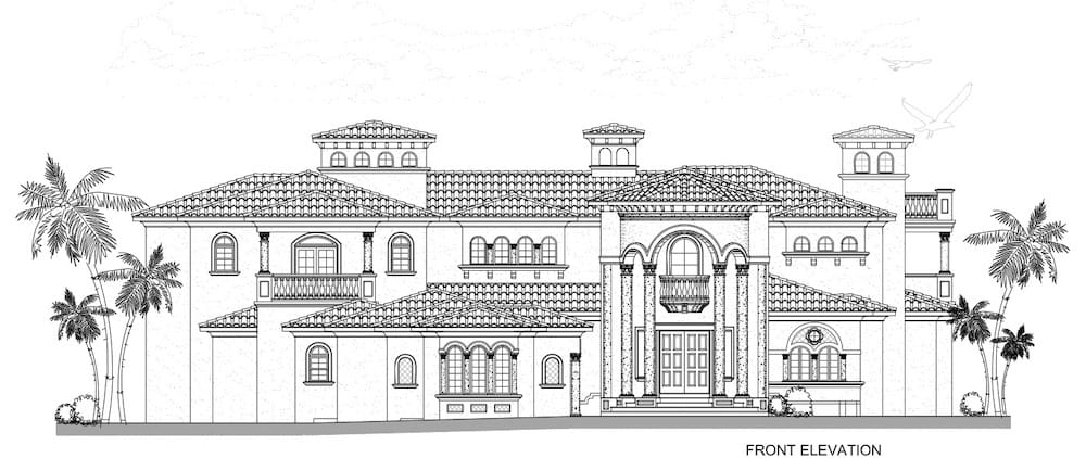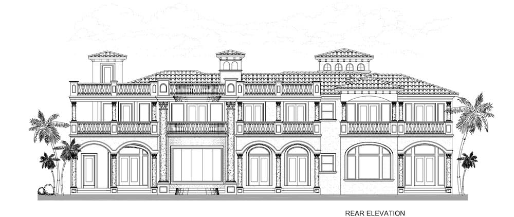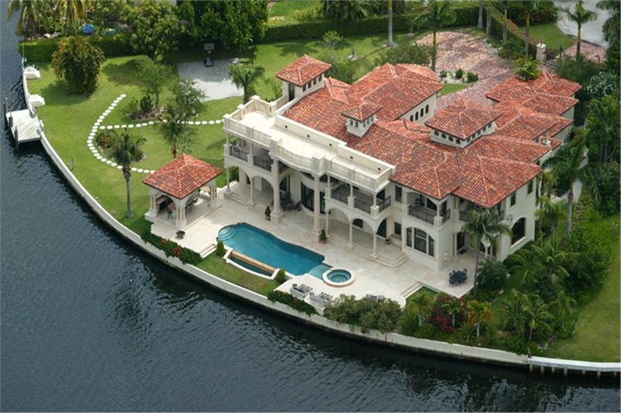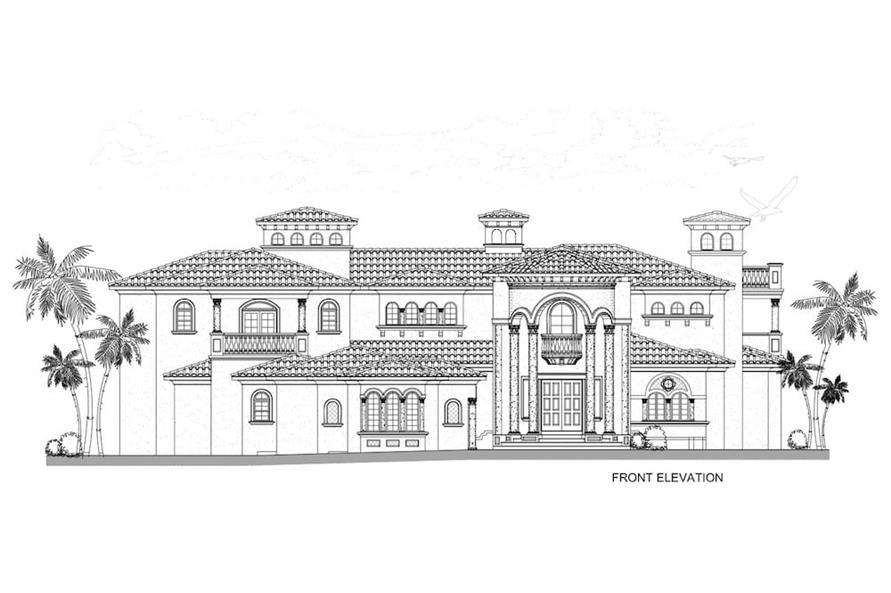 Luxury house plan #107-1219 features concrete block exterior construction. The covered entry with round columns and French doors allows you to enter through the foyer. Two sets of stairs lead you to the upper floor. The living room has a coffered ceiling and fireplace. The family room has access to the rear covered patio and is open to the bar and pool room. The pool room has access to the patio breakfast room, which has a snack bar to the kitchen. The kitchen is equipped with an island range, walk-in pantry, and ample cabinets. The butler's pantry leads to the dining...