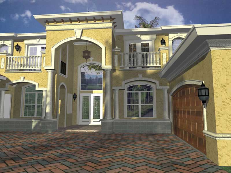 Luxury Houseplans #107-1056 have Classic Mediterranean style inside and out. The large Living Room features an elegant fireplace. The huge island Kitchen with an eating bar, opens to the Family Room. The Den/Library makes for a nice, quiet retreat. The luxurious master Suite with large Walk-In-Closets and morning kitchen, tray ceilings with regal master Bath and additional storage areas open to the private balcony.