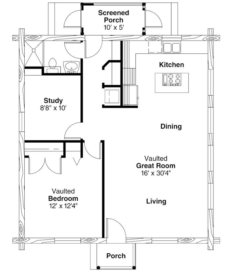 The #108-1280 home plan is a single story, cabin style house plan with 960 total living square feet. This cozy, naturally bright log cabin home plan is great as a vacation retreat or for a small family. Spacious vaulted great room is open to a large, well-equipped kitchen. This plan also features a single vaulted bedroom, plus a study with pull-down attic access.